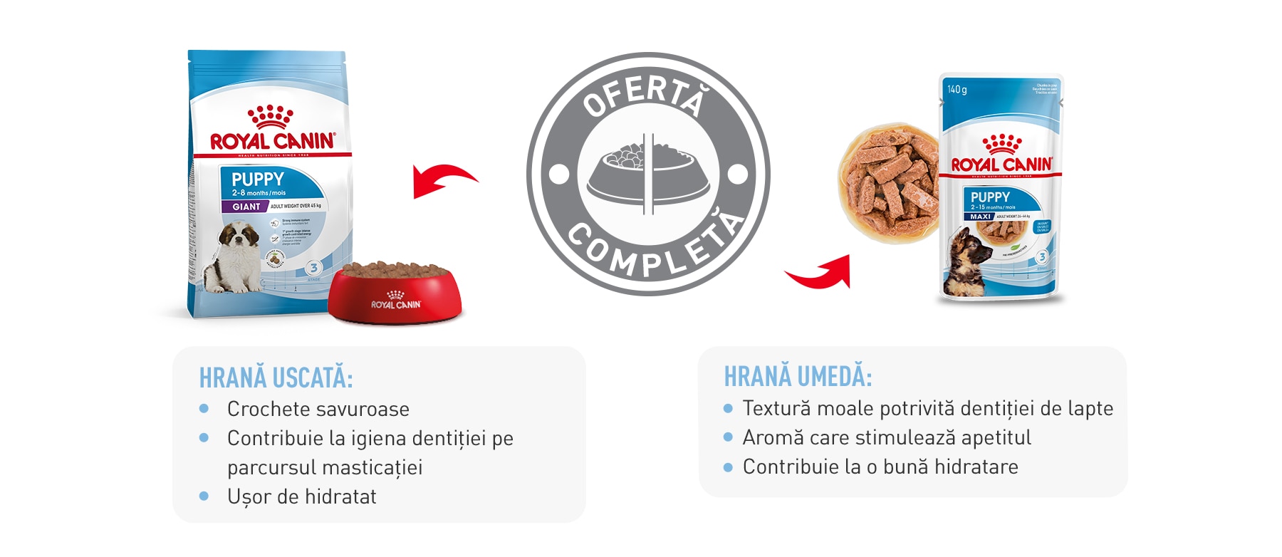 ROYAL CANIN® Giant Puppy contine nutrienti adaptati, care au rolul de a sustine ritmul intens de dezvoltare al puiului, incepand cu varsta de la 2 luni si pana la 8 luni, contribuind in acelasi timp la evitarea cresterii excesive in greutate.