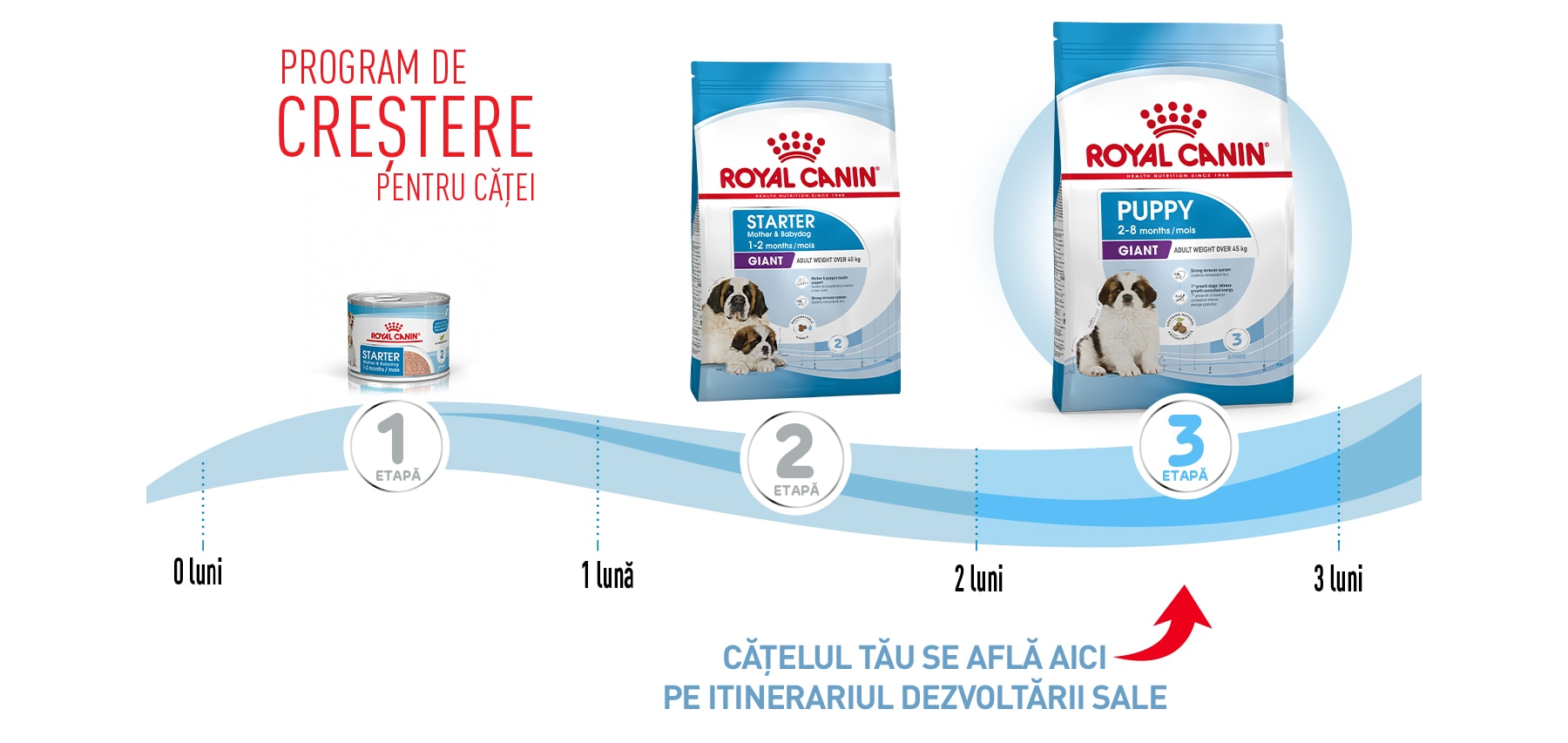 Cainii de talie foarte mare au nevoie de aproximativ 18-24 de luni pentru a atinge greutatea de peste 45 kg, echivalenta stadiului de adult. In acest interval, cerintele lor nutritionale se modifica, asadar am dezvoltat doua formule nutritionale: ROYAL CANIN® Giant Puppy, dedicata cateilor cu varsta cuprinsa intre 2 si 8 luni, si ROYAL CANIN® Giant Junior, pentru perioada cuprinsa intre 8 si 18/24 de luni.