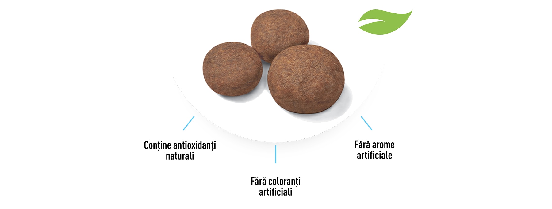 Compozitie: Proteine de carne de pasare deshidratata, gluten de grau*, orez, porumb, faina de porumb, grasimi animale, faina de grau, pulpa de sfecla, proteine animale hidrolizate, saruri minerale, gluten de porumb, ulei de soia, produse din drojdii, ulei de peste, fructo-oligozaharide, tegumente si seminte de psyllium, drojdie hidrolizata (sursa de mano-oligozaharide si beta glucani) (0,30%), ulei de alge Schizochytrium sp. (sursa de DHA), suc de Yucca Schidigera, faina din craite, glucozamina obtinuta prin fermentatie, cartilaj hidrolizat (sursa de condroitina).