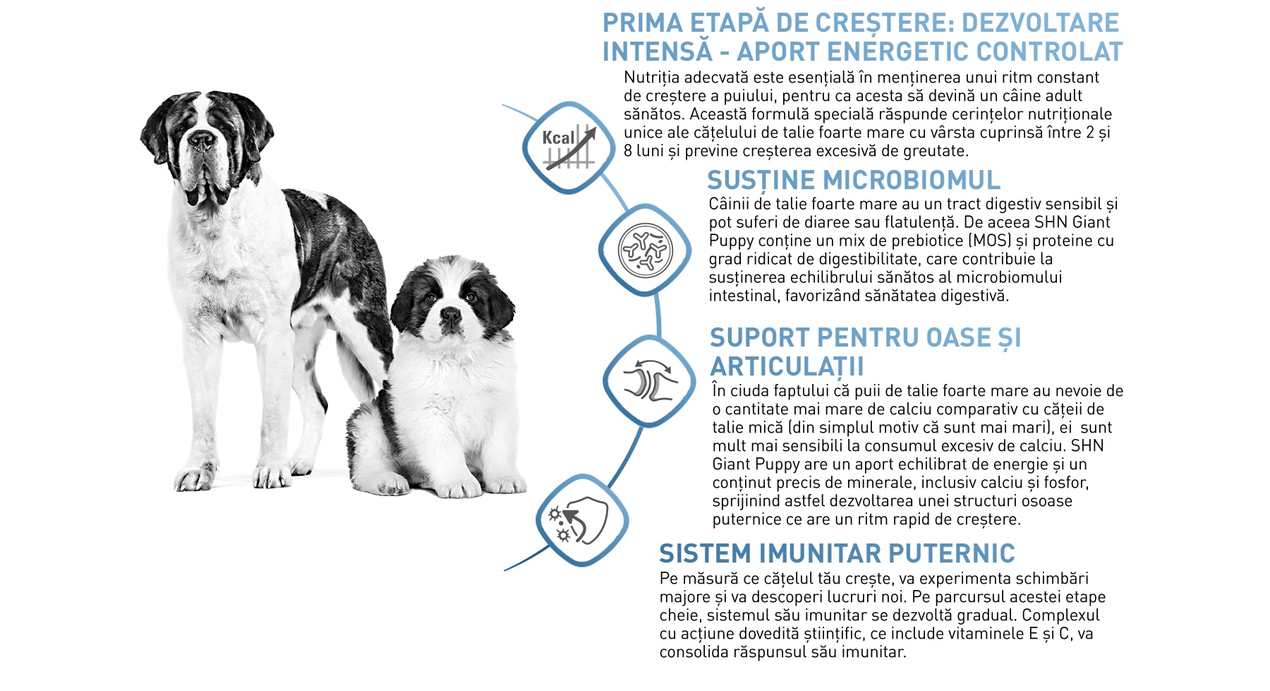 Pe durata acestei perioade marcata de un ritm intens de crestere al catelului dumneavoastra de talie foarte mare, puiul are nevoie de suficiente calorii si de nutrientii potriviti pentru a creste sanatos. Acum se dezvolta oasele, muschii, simturile si sistemul nervos ale catelului dumneavoastra. Este si perioada in care anticorpii pe care catelul i-a primit de la mama prin intermediul colostrului se reduc, ceea ce inseamna ca are nevoie de un aport optim de proteine pentru a-si construi propriul sistem imunitar.