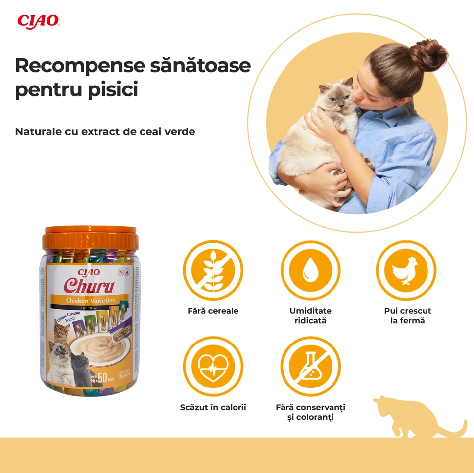 Churu face ca momentul oferirii unei recompense sa fie distractiv pentru pisici. Aceste recompense gustoase, sanatoase si amuzante sunt prezente in ambalaje usor de deschis, pe care pisica dumneavoastra pur si simplu le va adora!